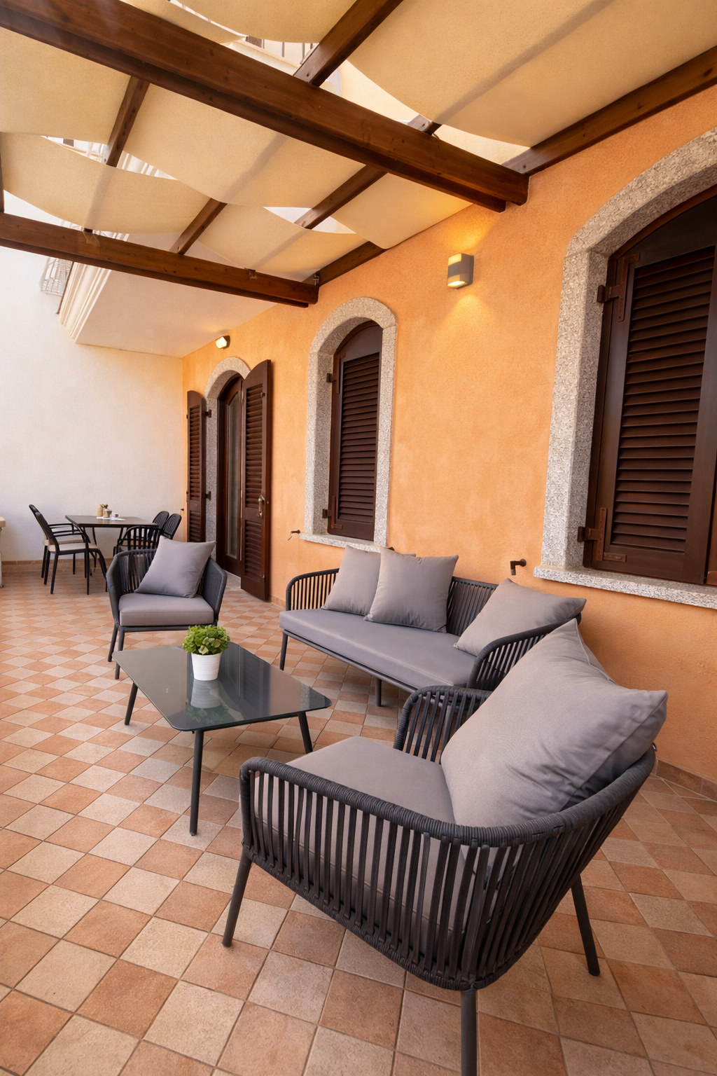 Outside, a delightful private terrace with table and chairs and a sitting area will allow you to enjoy breakfast in the morning sun, an aperitif, or a quiet dinner in the evening breeze.